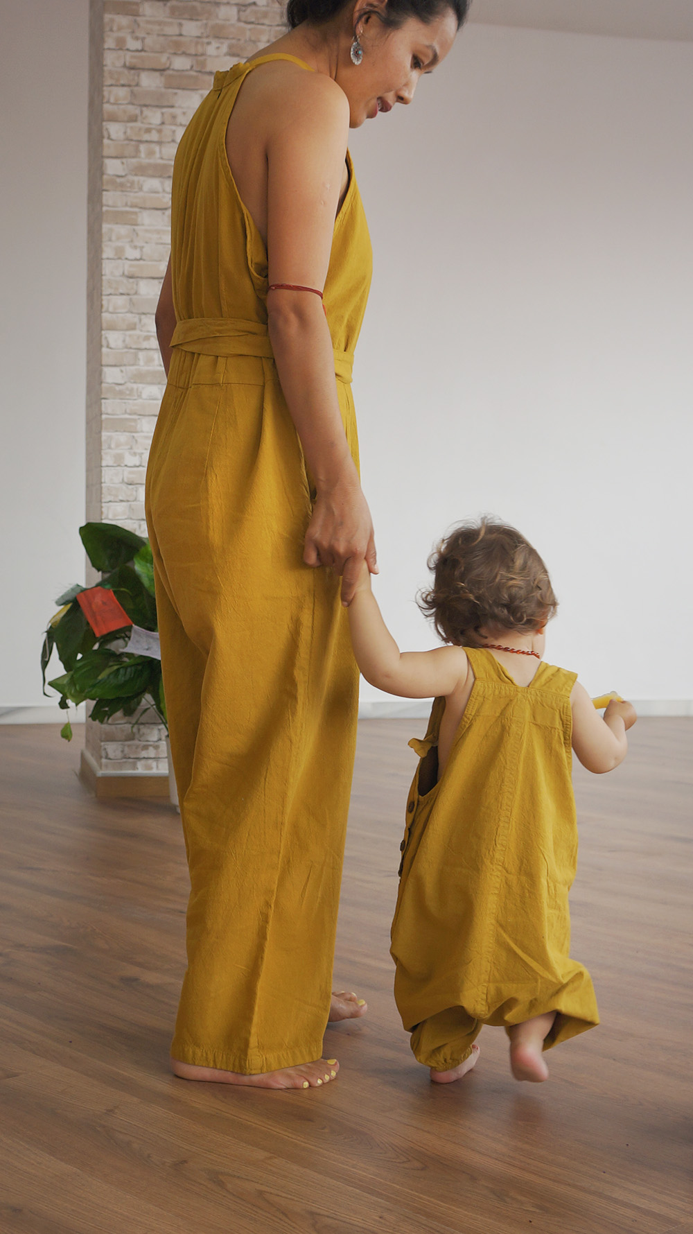 Peto ancho de tirantes con botones y con elástico ajustado en los tobillos. Color amarillo. Lleva bolsillo grande en el pecho y 2 bolsillos normales. El material es 100% algodón y está confeccionado a mano en Nepal. Es un producto de gran calidad y tacto agradable.