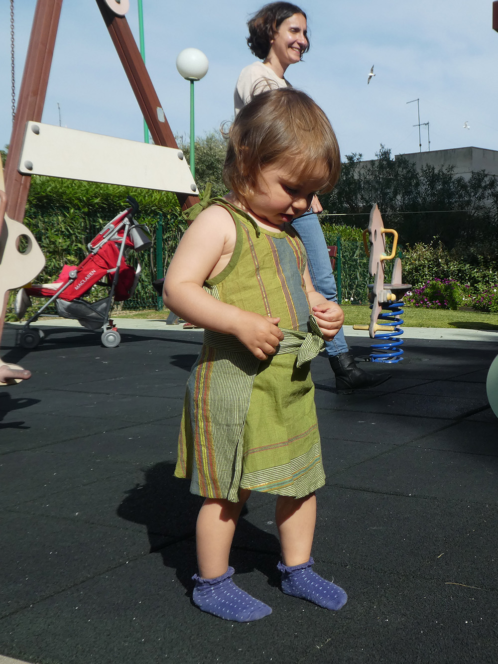 Vestido corto color verde decorado con lineas verticales. Consta de 2 piezas; un top de tirantes cruzados por detrás y una falda que se ata con un lazo a la cintura. El material es 100% algodón y está confeccionado a mano en Nepal. Es un producto de gran calidad y tacto agradable.
