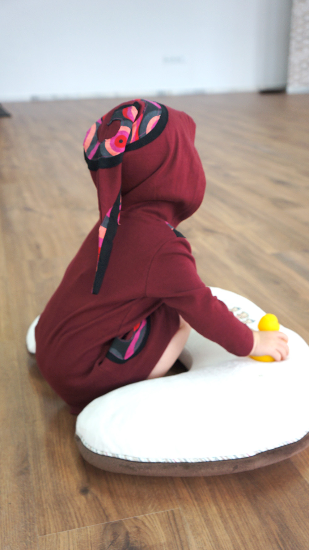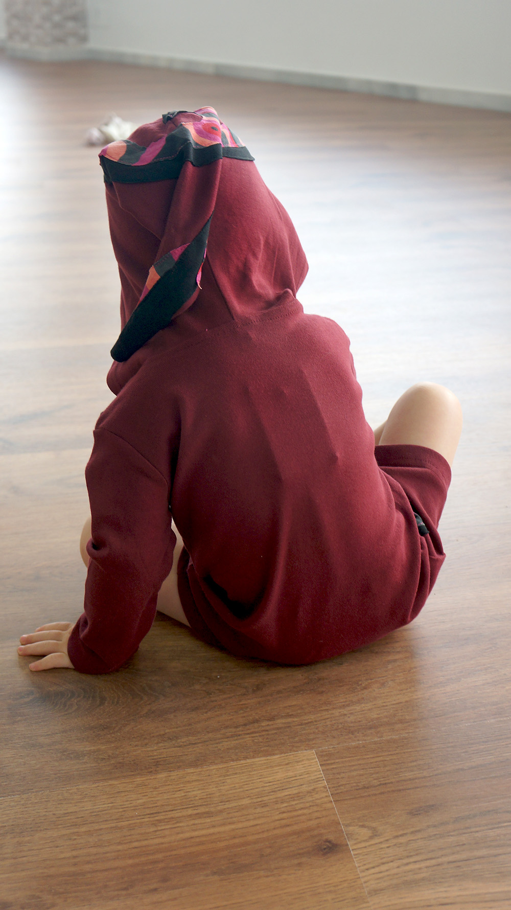 Vestido corto granate, de manga larga, con graciosa capucha. El corte de los bajos es en diagonal y tiene un bonito adorno en la zona del pecho, de donde sale la capucha.Peto ancho de tirantes con botones y con elástico ajustado en los tobillos. Color lila claro. Lleva bolsillo grande en el pecho y 2 bolsillos normales. El material es 100% algodón y está confeccionado a mano en Nepal. Es un producto de gran calidad y tacto agradable.