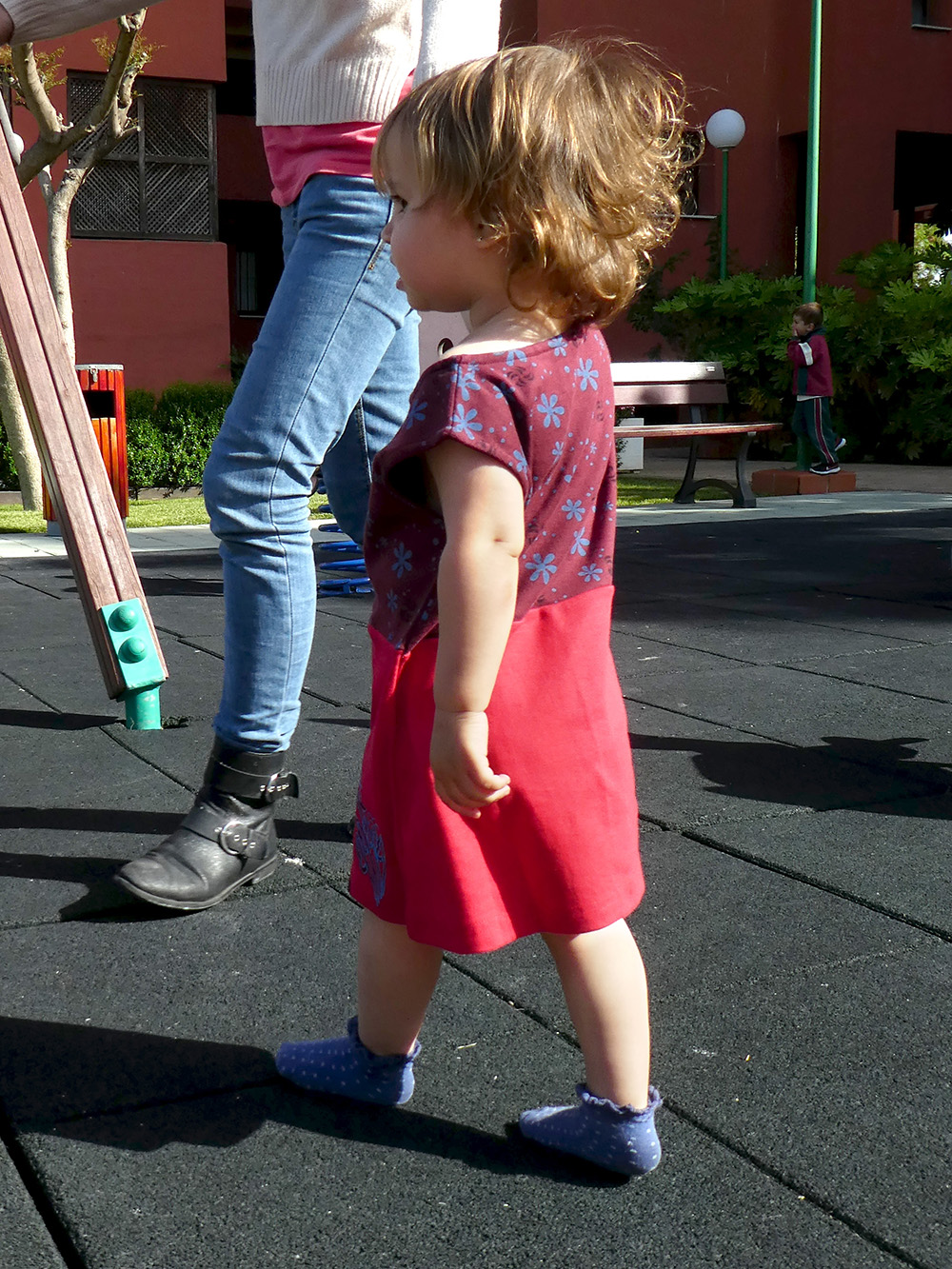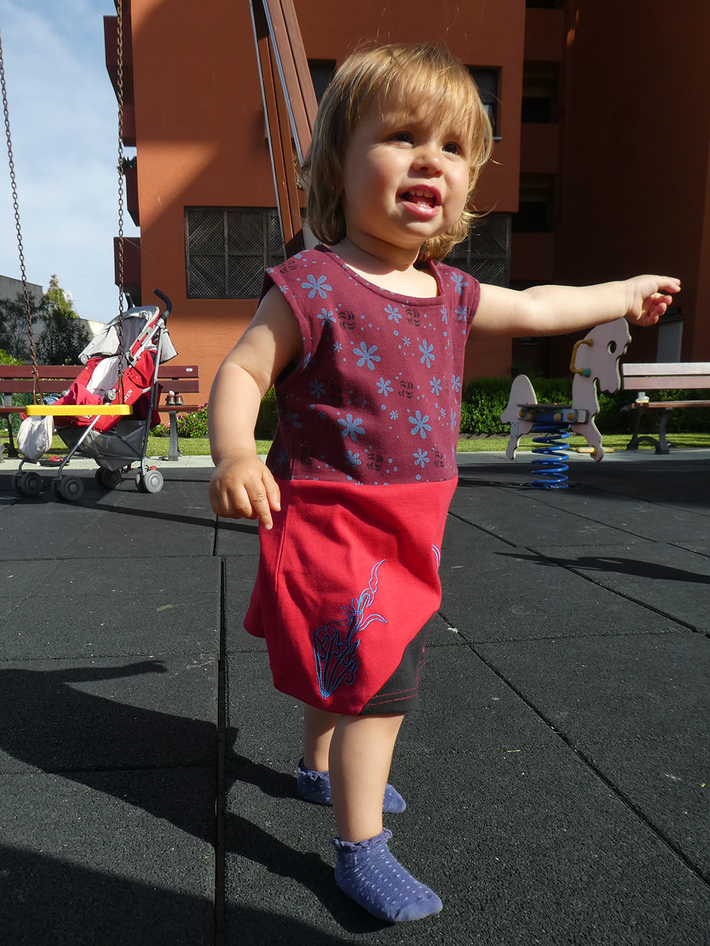Vestido corto de manga corta. Parece un 2 piezas de camiseta y falda, pero es una sola pieza junta con la falda roja y la camiseta morada decorada con flores azules. El material es 100% algodón y hecho a mano en Nepal. Es un producto de gran calidad y tacto agradable.17