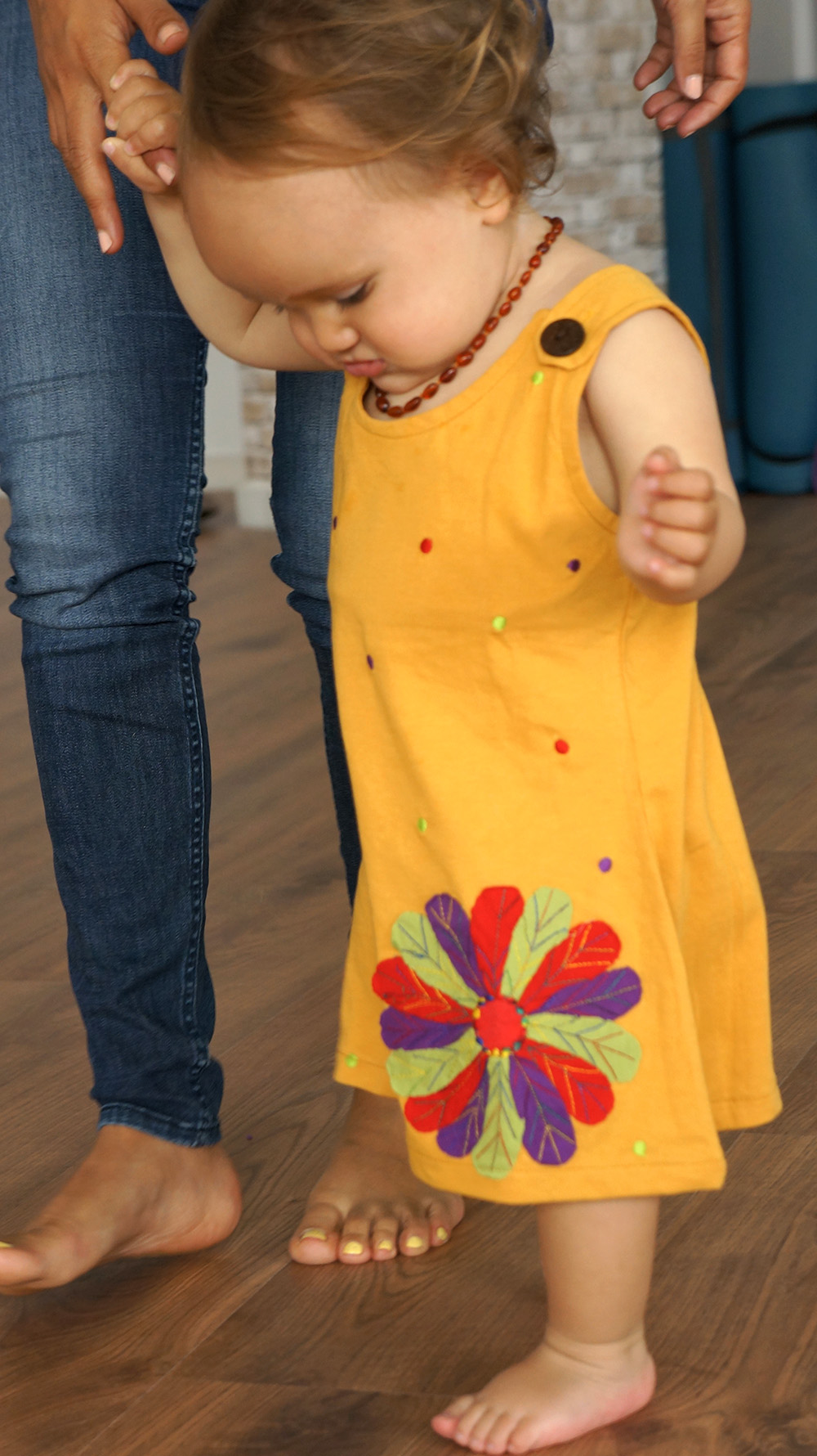 Vestido corto amarillo sin mangas, con tirantes abotonados, decorado con una gran flor en la parte frontal baja y con topos de colores.. El material es 100% algodón y está confeccionado a mano en Nepal. Es un producto de gran calidad y tacto agradable.