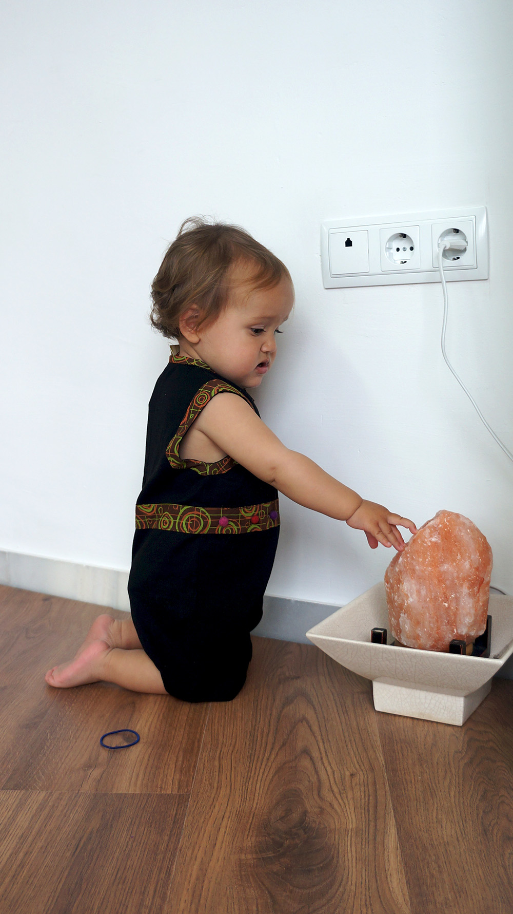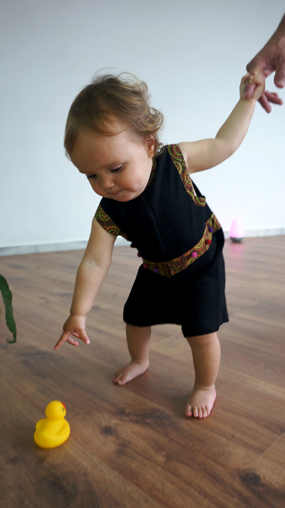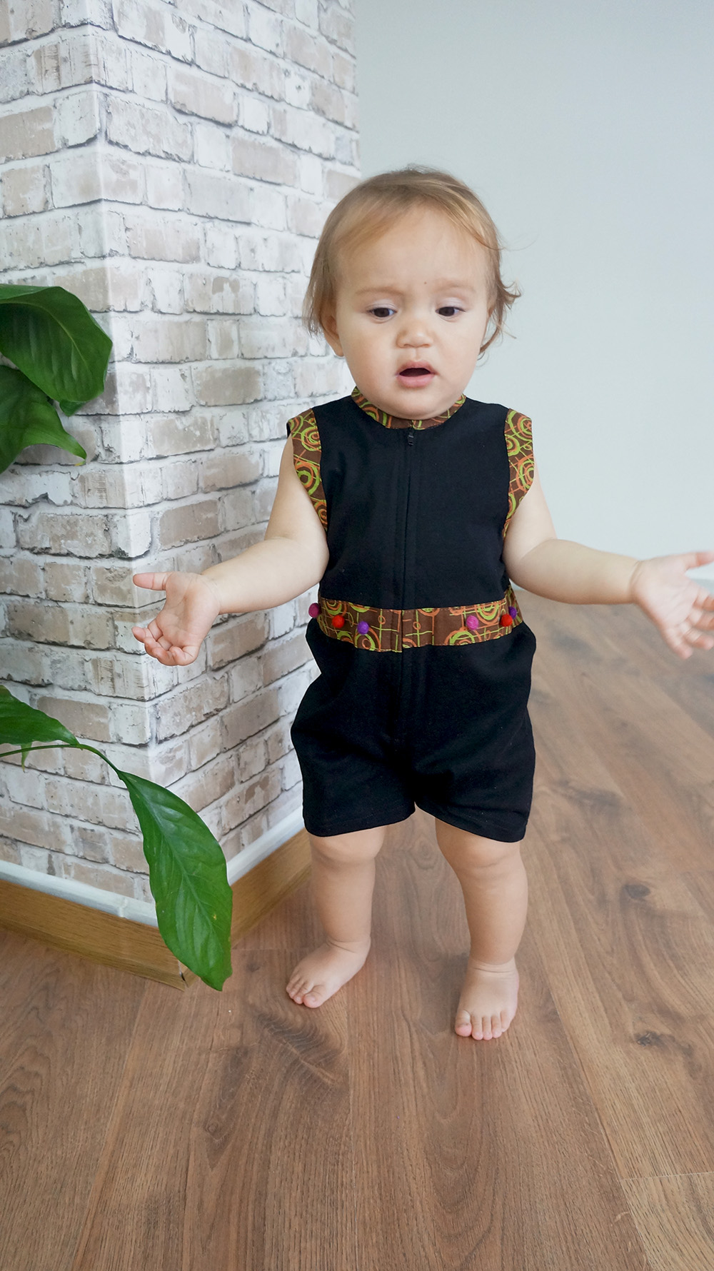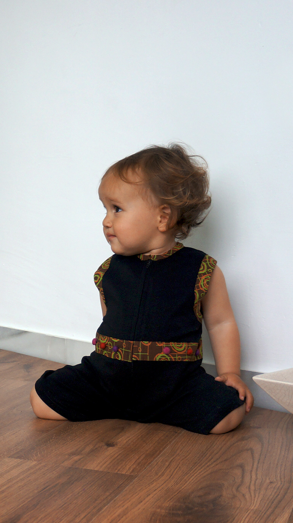 Mono negro sin mangas y de pantalón corto, con bonitas cenefas marrones en cintura, cuello y hombros. El material es 100% algodón y está confeccionado a mano en Nepal. Es un producto de gran calidad y tacto agradable.