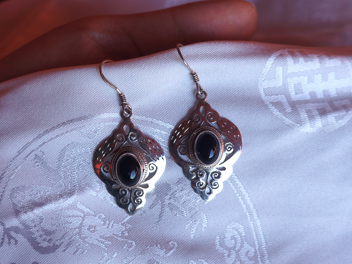 Pendientes de plata en forma de hoja boca abajo, con un hermoso calado y una piedra ovalada oscura en el centro. Hecha mano.