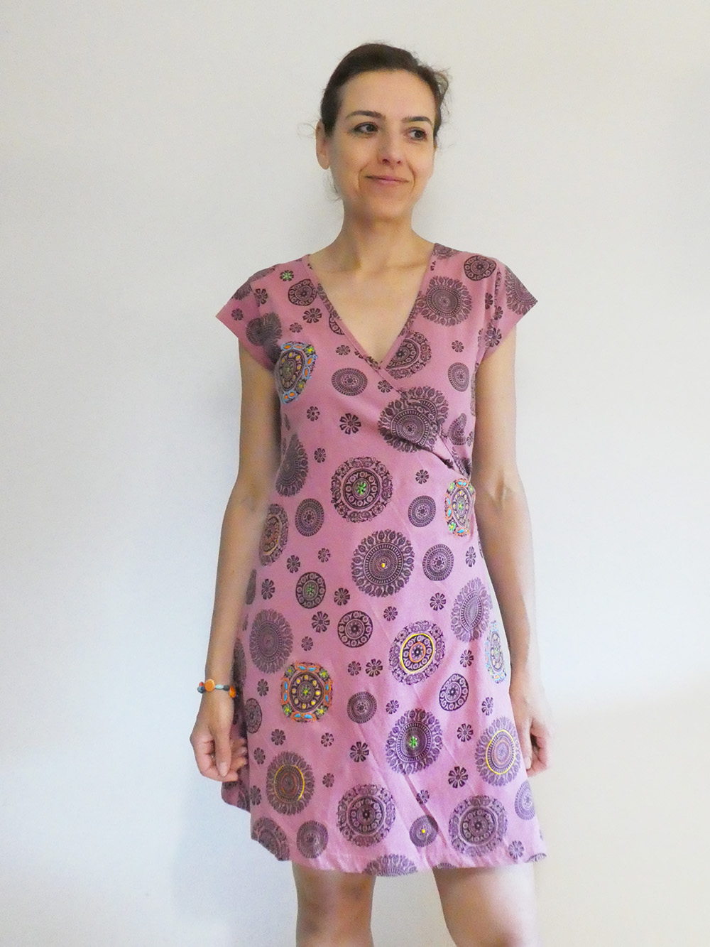 Vestido corto rosa clarito de manga corta. Lleva escote de pico y cinturón, y va adornado con bonitos círculos que parecen mandalas tibetanos. Ideal para verano. El material es 100% algodón y está confeccionado a mano en Nepal. Es un producto de gran calidad y tacto agradable.