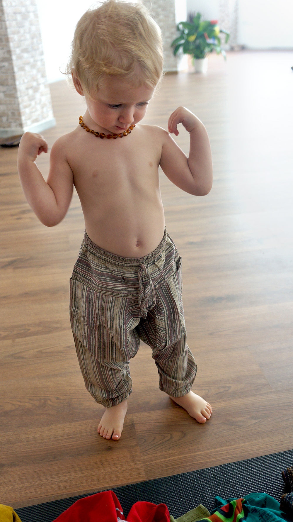 Pantalones anchos de cintura elástica, con decoración de rayas. Color gris clarito. El material es 100% algodón y está confeccionado a mano en Nepal. Es un producto de gran calidad y tacto agradable.